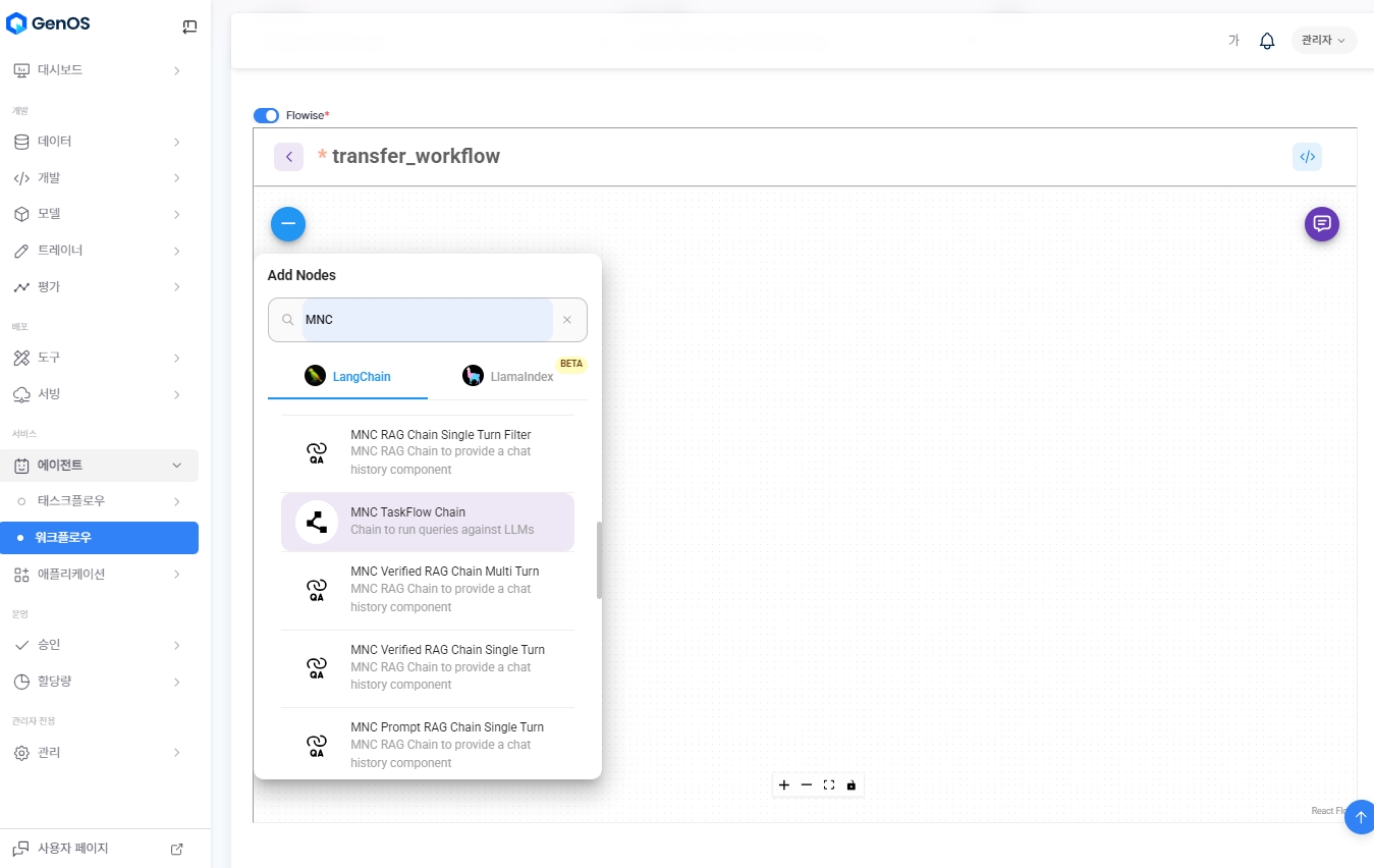 계좌 이체 챗봇 플로우를 위해 노드를 추가합니다. + 버튼을 클릭하여 필요한 노드를 검색합니다.