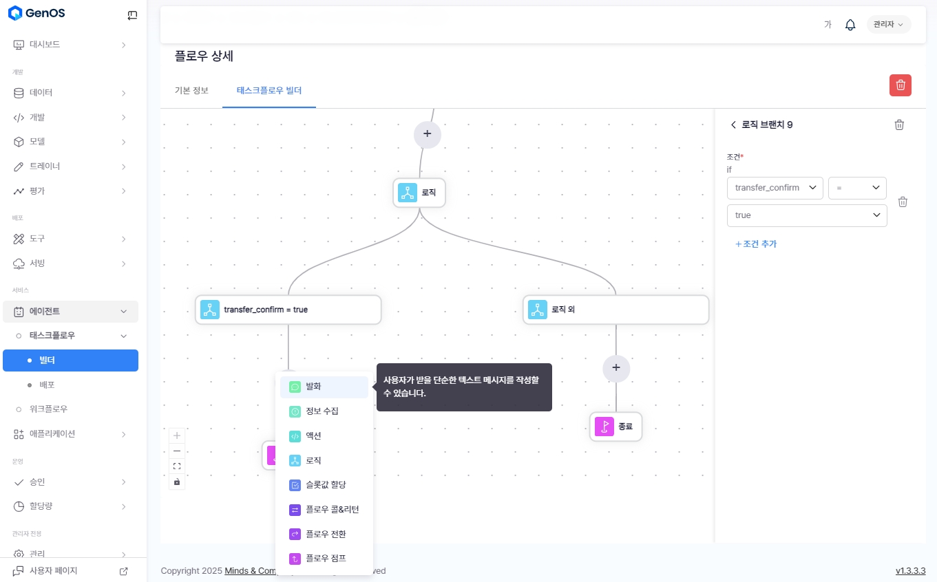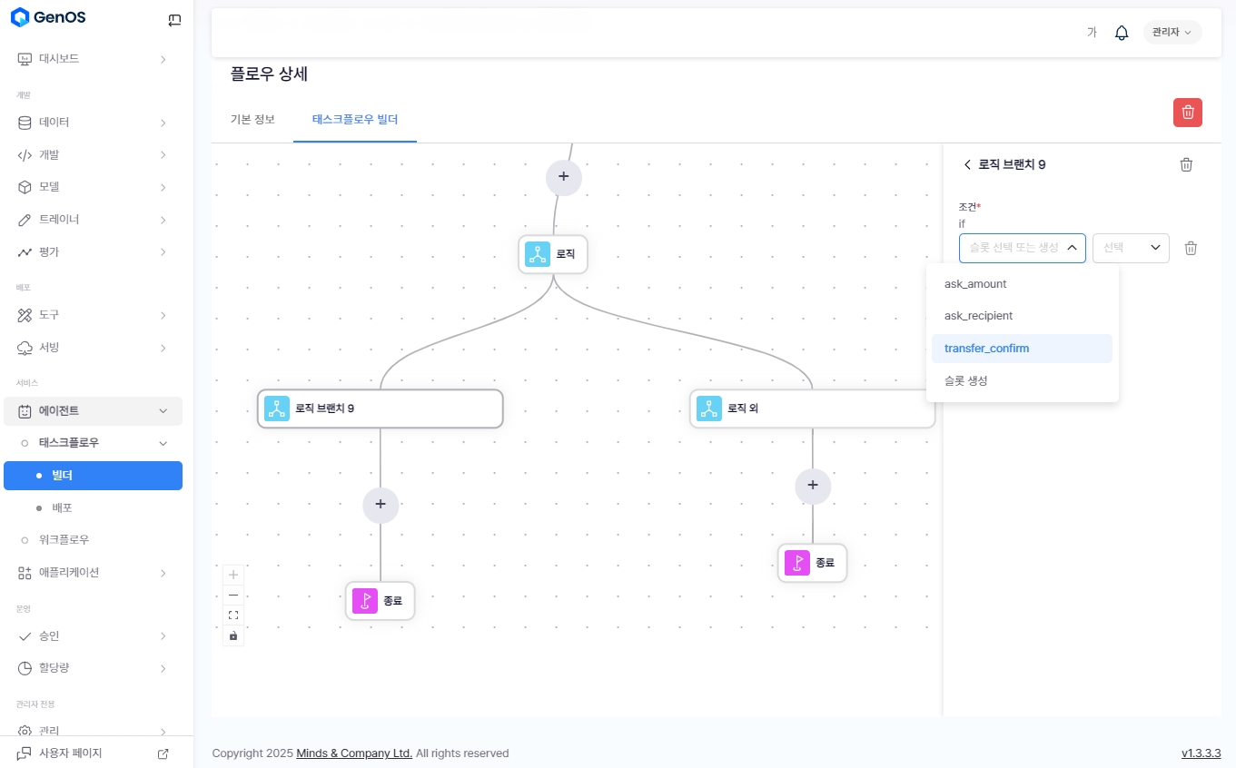 로직의 조건을 설정합니다. 예: “if transfer_confirm = true”