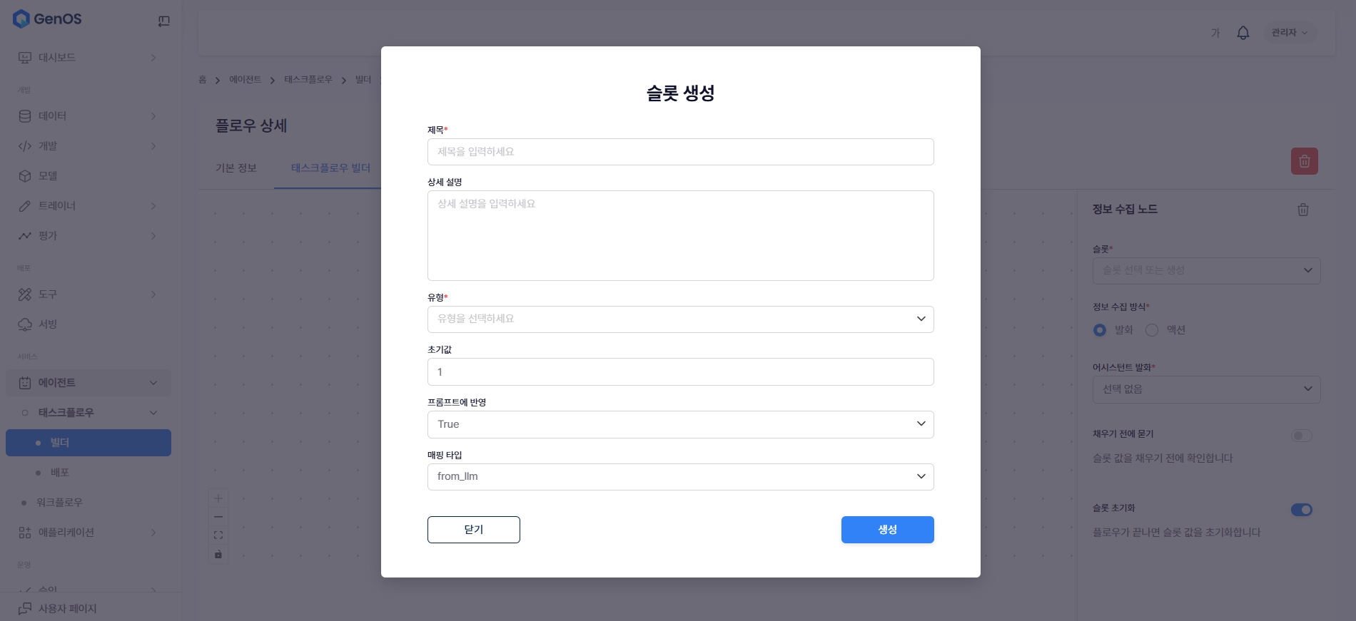 슬롯 항목의 드롭박스 클릭 후 ‘슬롯 생성’ 항목을 선택합니다. 플로우 조건에 따라 슬롯을 신규 생성합니다.