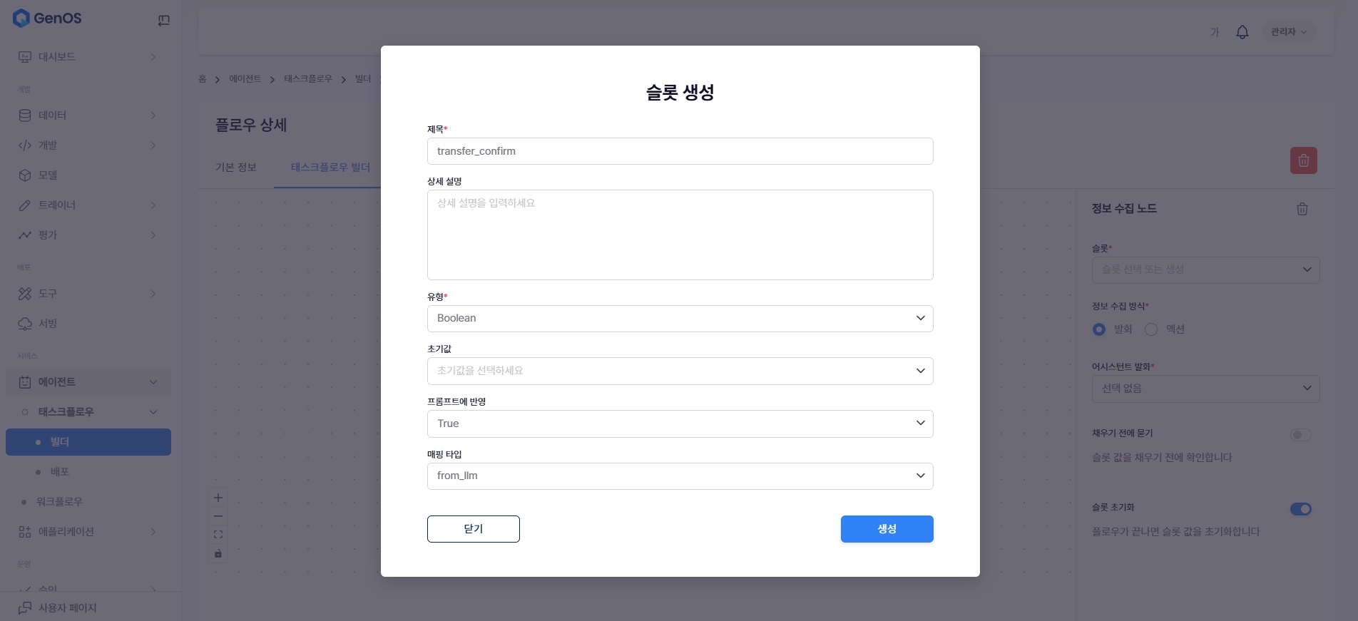 상세 설명 : 슬롯의 상세 설명을 입력합니다. 예: “최종 계좌 이체 정보가 맞다면 예, 틀리면 아니오로 답변을 받습니다.”
