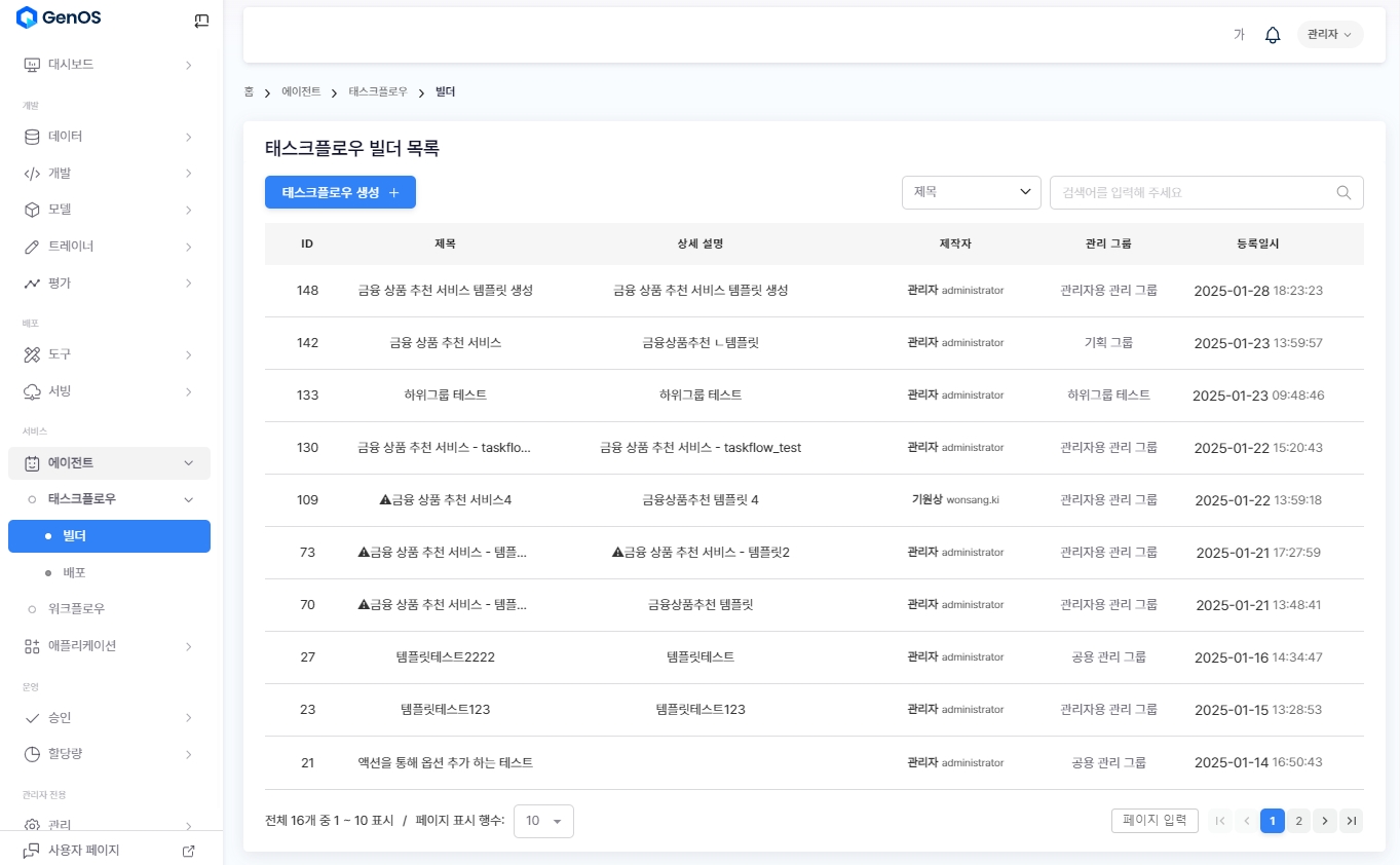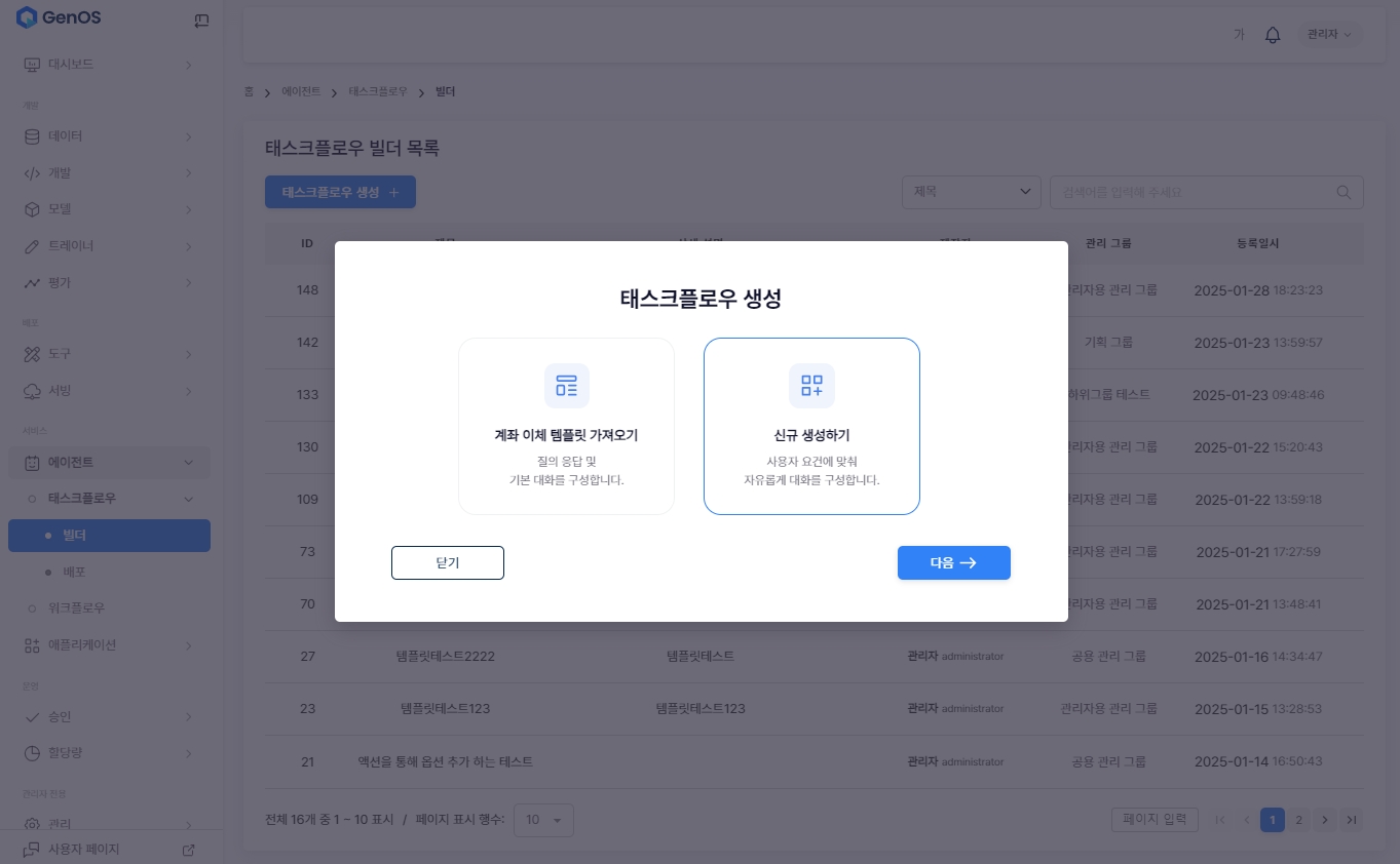 태스크플로우 생성 버튼을 클릭하여 새로운 태스크플로우를 생성합니다.