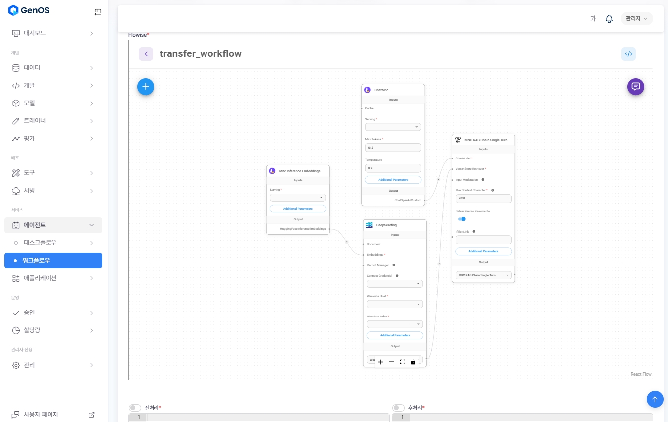 워크플로우 : 채팅에서 사용할 워크플로우를 선택합니다. 예: “transfer_workflow”