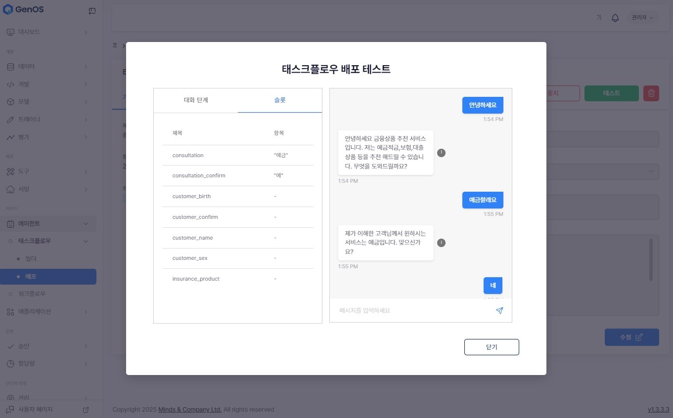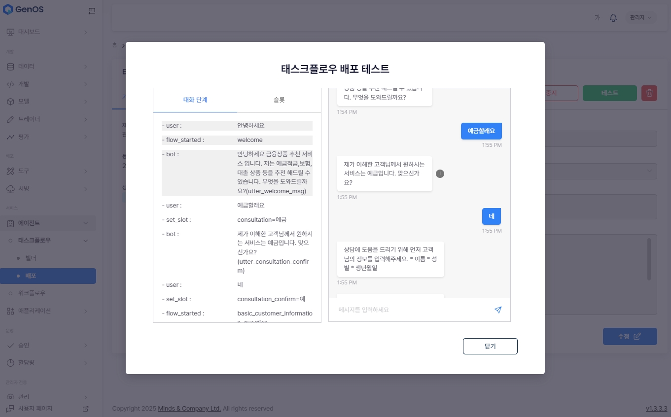 테스트 버튼을 클릭하여 태스크플로우를 테스트합니다. 대화 단계 / 슬롯 탭을 제공하며, 테스트 메시지에 따라 상세 정보를 제공합니다.