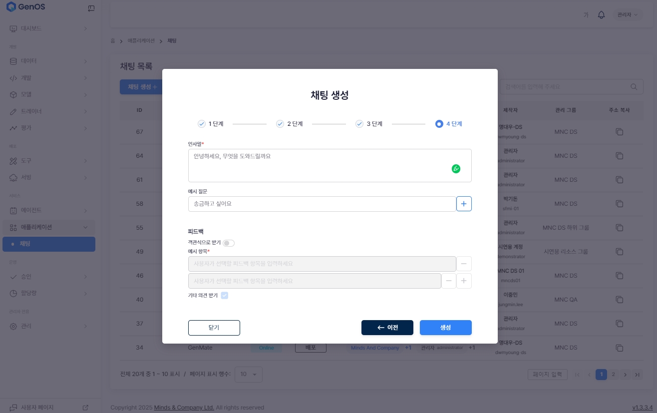 사용자 화면에 보여질 인사말과 예시 질문을 추가 후 생성 버튼을 클릭합니다.