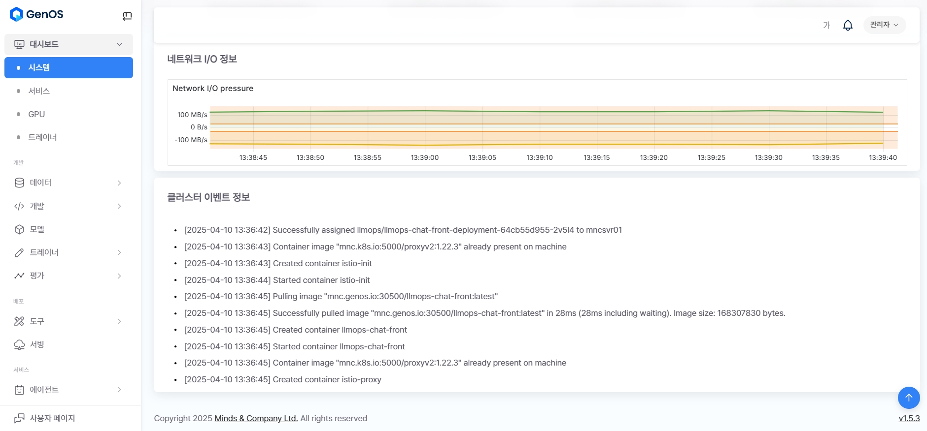 Network I/O Pressure: 클러스터 전체의 입출력 트래픽을 초당 단위로 시각화한 그래프. 송수신 대역폭 수준을 실시간 파악 가능