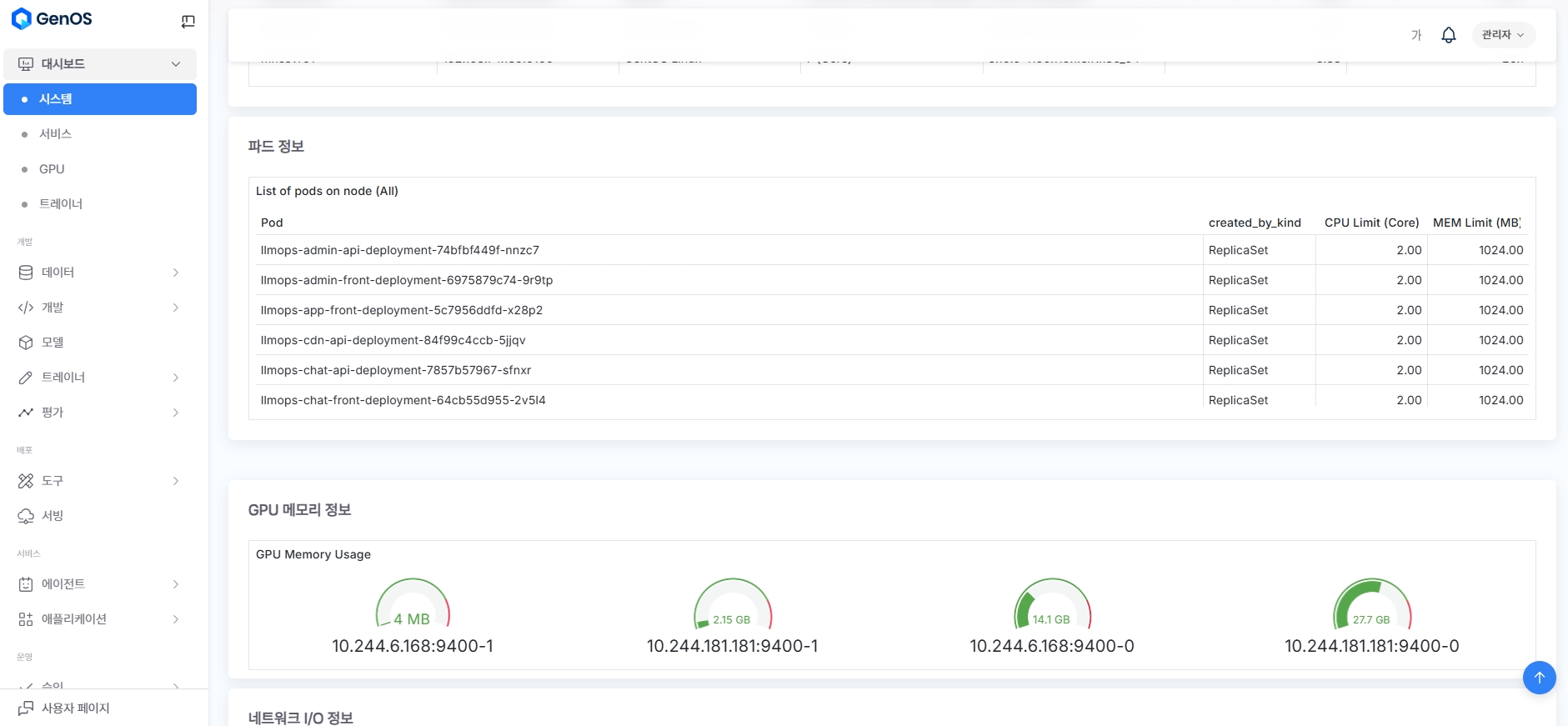 대시보드의 시스템 메뉴는 관리자 시스템 전체의 상태를 실시간으로 모니터링하는 메뉴입니다.