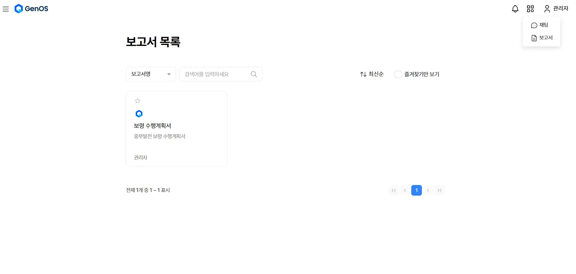 정렬 필터(최신순, 오래된 순, 보고서 오름차순, 보고서 내림차순)를 선택하여 보고서 목록을 조회할 수 있습니다.