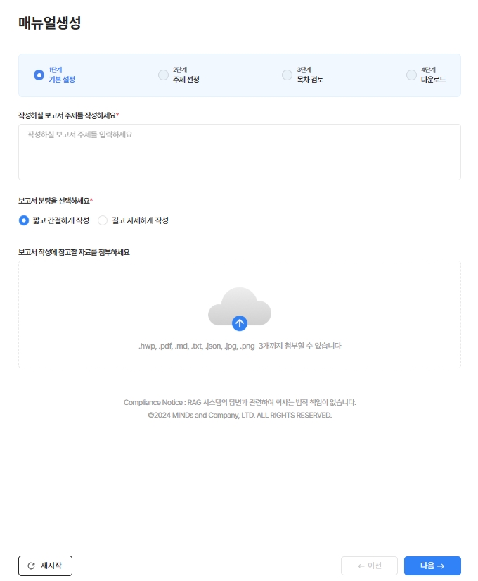 재시작 버튼: 클릭 시, 현재 보고서 작성을 종료하고, 새로 재시작할 수 있습니다. 각 단계 마다 존재하는 버튼이며 1단계의 작성 전 상태로 돌아갑니다.