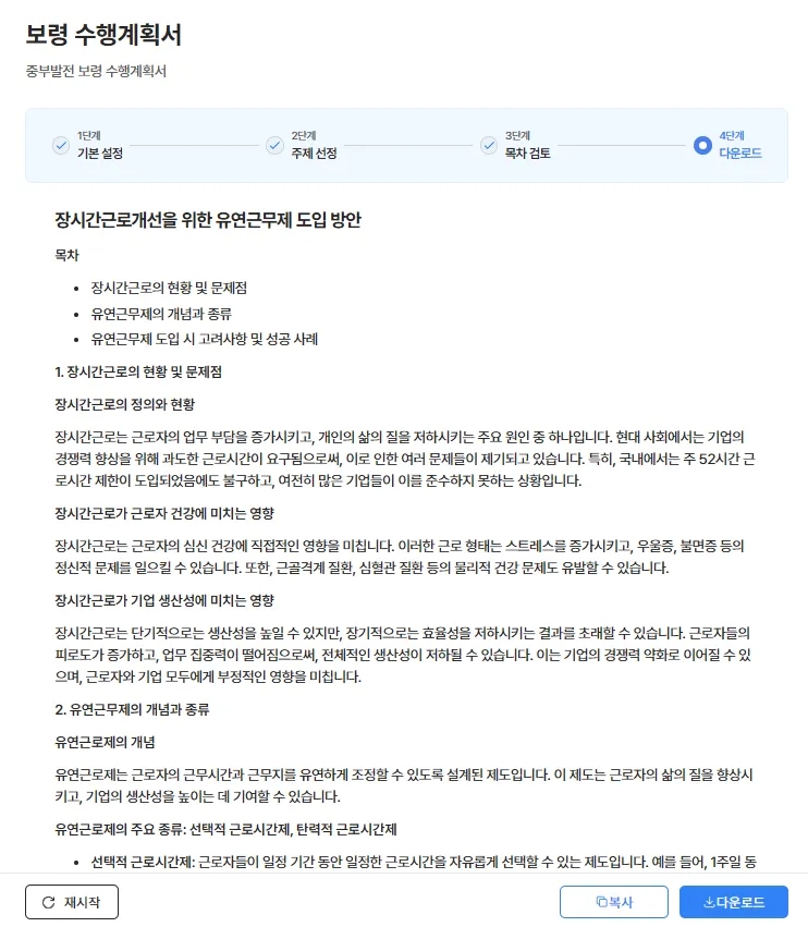 총 단계는 1단계(기본설정) > 2단계(주제선정) > 3단계(목차검토) > 4단계(다운로드)로 구성되어있습니다.