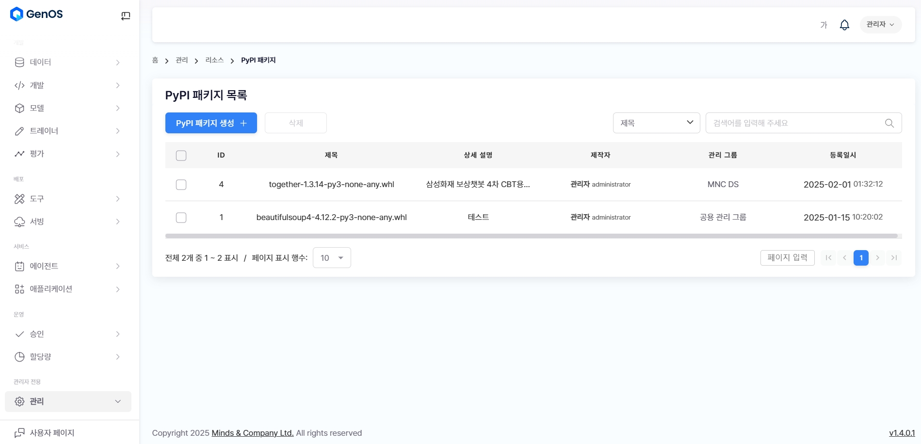 PyPI 패키지 삭제: 체크박스로 PyPI 패키지를 선택 시, 삭제 버튼이 활성화됩니다.
