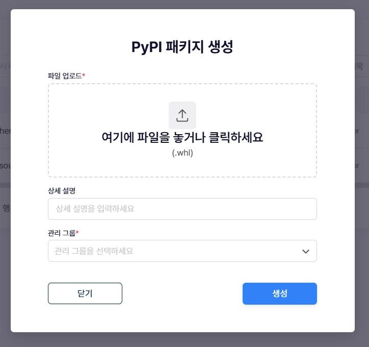 파일 업로드: 생성할 PyPI 패키지 파일을 업로드. 파일 형식은 .whl만 지원합니다.